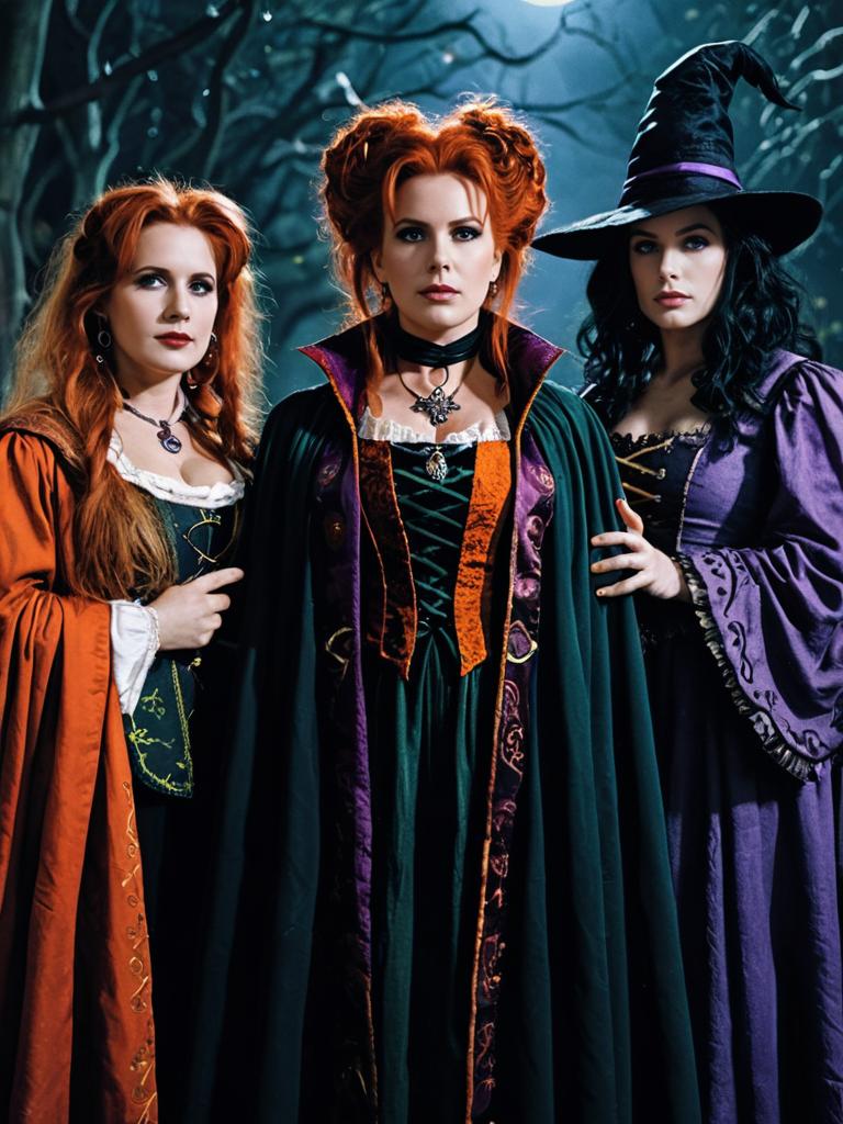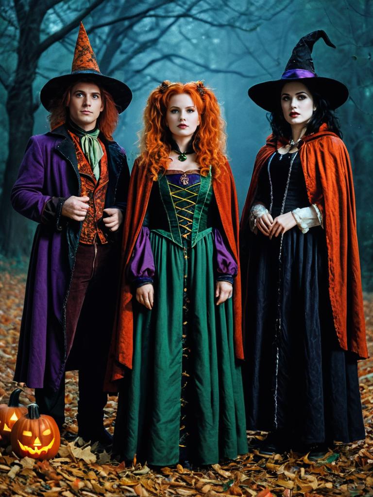 Group in Hocus Pocus Cosplay, photorealistic Halloween costume portrait, cinematic realism