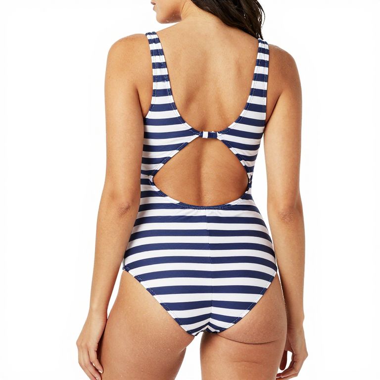 Photograph of a woman standing with her back to the camera, wearing a navy and white striped one-piece swimsuit. The swimsuit has a large keyhole cutout at the back, revealing a significant portion of her lower back. Her dark hair is straight and falls to her shoulders. She has a light to medium skin tone. The background is plain white, making the swimwear the focal point. The stripes are evenly spaced, and the swimsuit fits snugly, accentuating her waist and hips. Her right arm is slightly bent at the elbow.