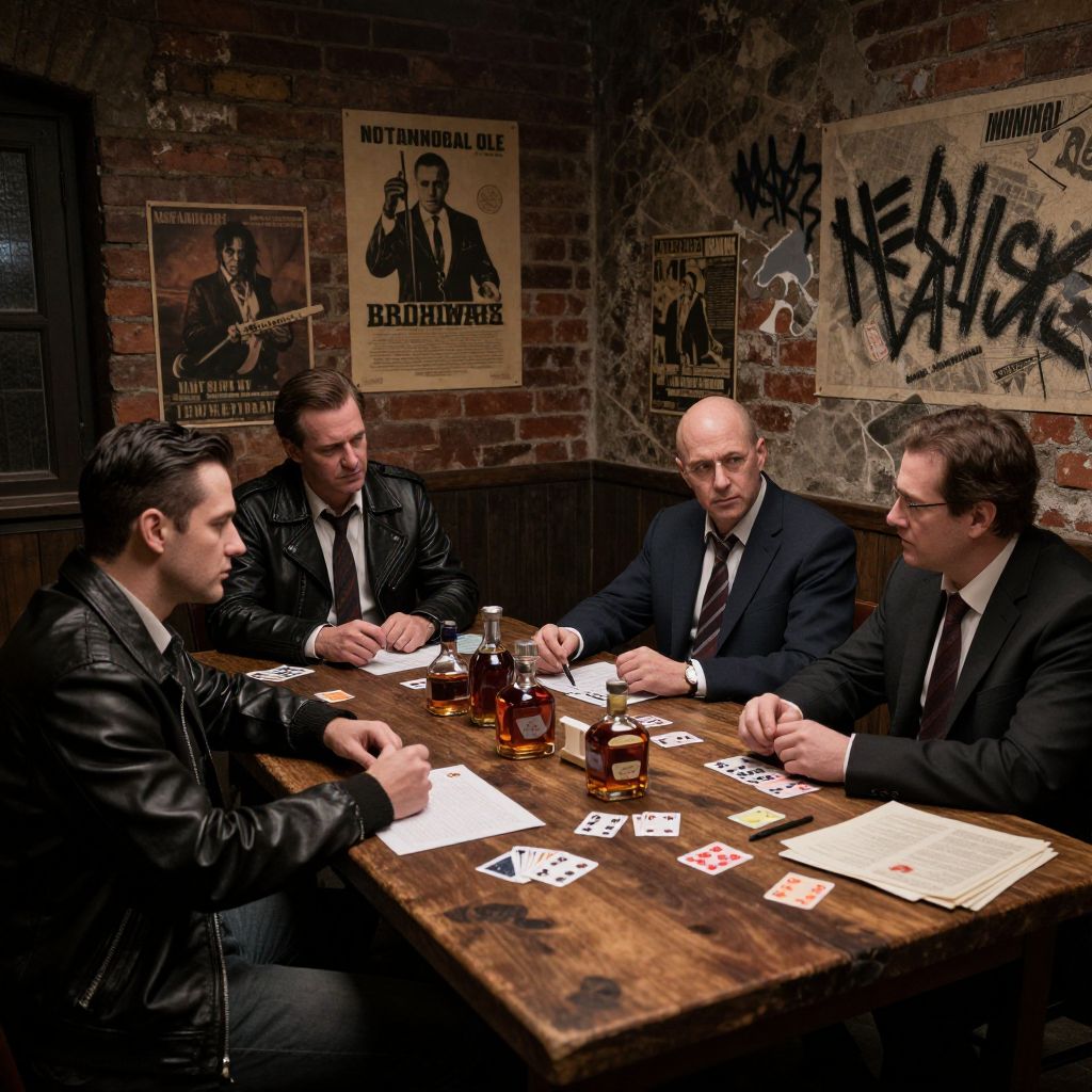 Mafia meeting room, dark and gritty ambiance, exposed brick walls with graffiti, rustic wooden table cluttered with whiskey bottles and playing cards, men in leather jackets and tailored suits discussing plans, vintage posters on walls, suspenseful vibe