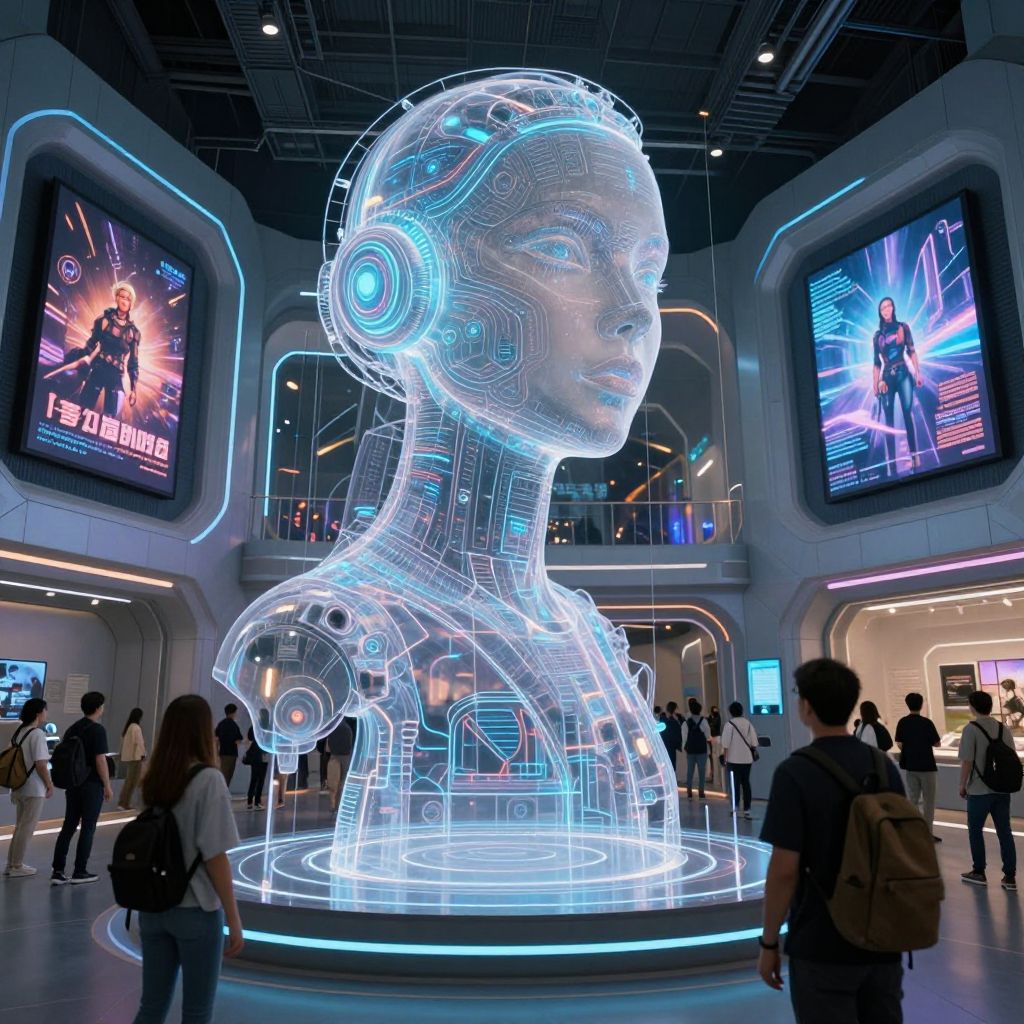 A futuristic, cyberpunk-style museum building with a holographic AI woman head, transparent life-size holograms, and billboards, surrounded by an energetic audience.