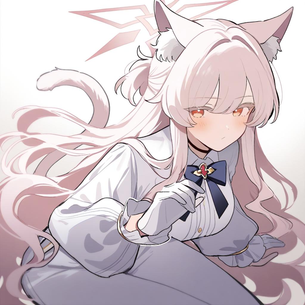 Akira (blue archive), blue archive, 1girl, cat girl, cat ears, animal ear fluff, cat tail, red eyes, hair between eyes, colored eyelashes, long hair, white hair, pink hair, white shirt, white gloves, white pants, halo, pink halo, long sleeves, black choker, by artist meeko, animagine