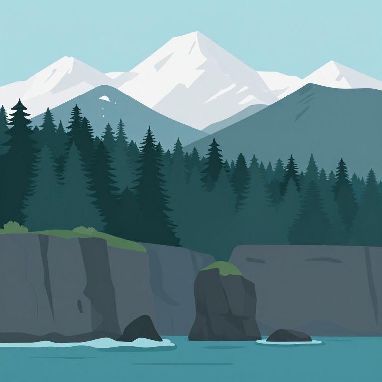 Period flat, illustration, Olympic National Park coastline seastacks at the bottom, forest in the middle, snow capped mountains at the top, minimalist, 3-colors,