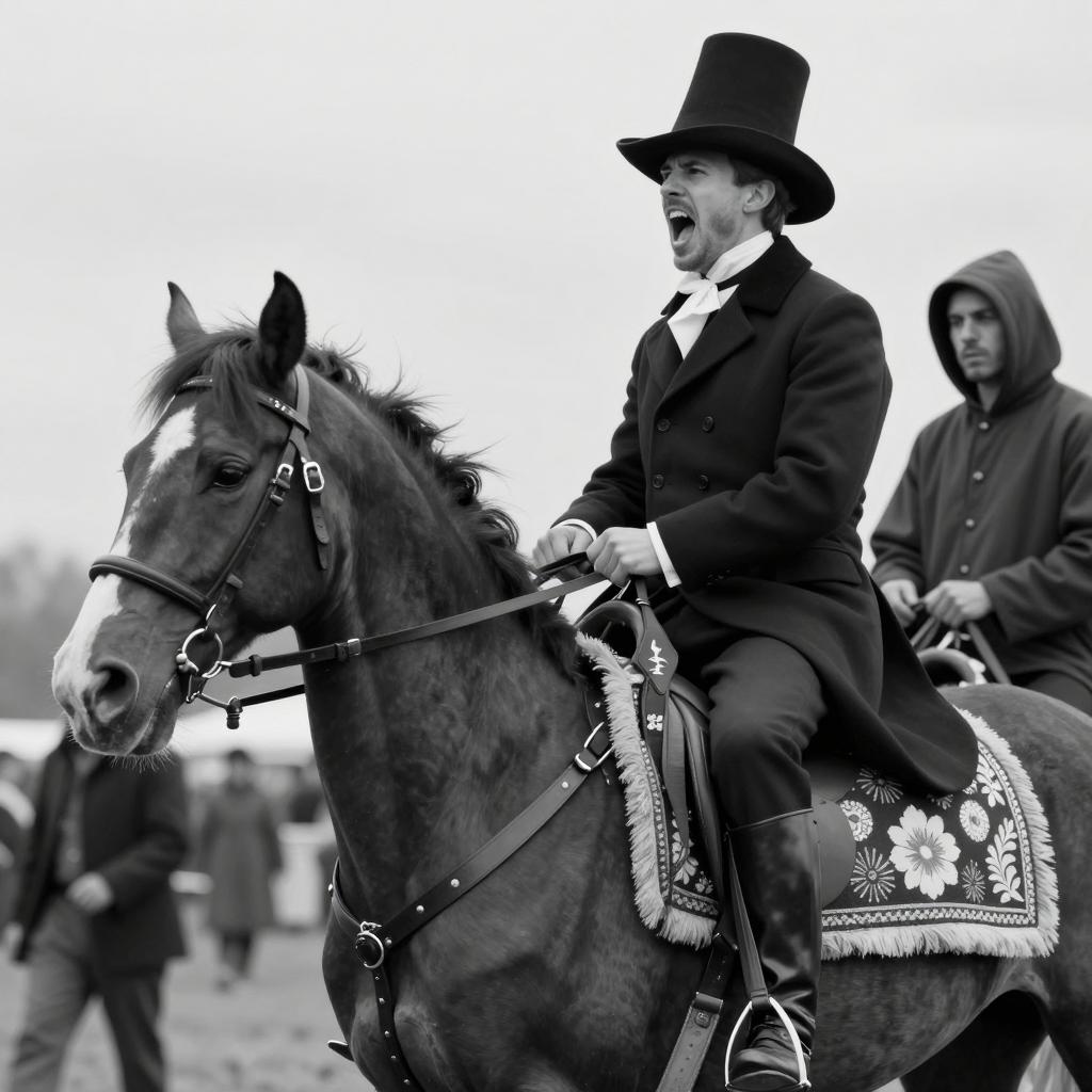 Black and white photograph of a man with an open mouth, shouting, wearing a tall hat and dark coat, riding a decorated horse. Another man in a hood holds the horse's reins. The horse is in motion, with a patterned blanket. A third person, partially visible, is in the background. The man riding the horse has intense facial expression. Multiple people, horse, decorative blanket, patterned blanket, hooded figure, tall hat.