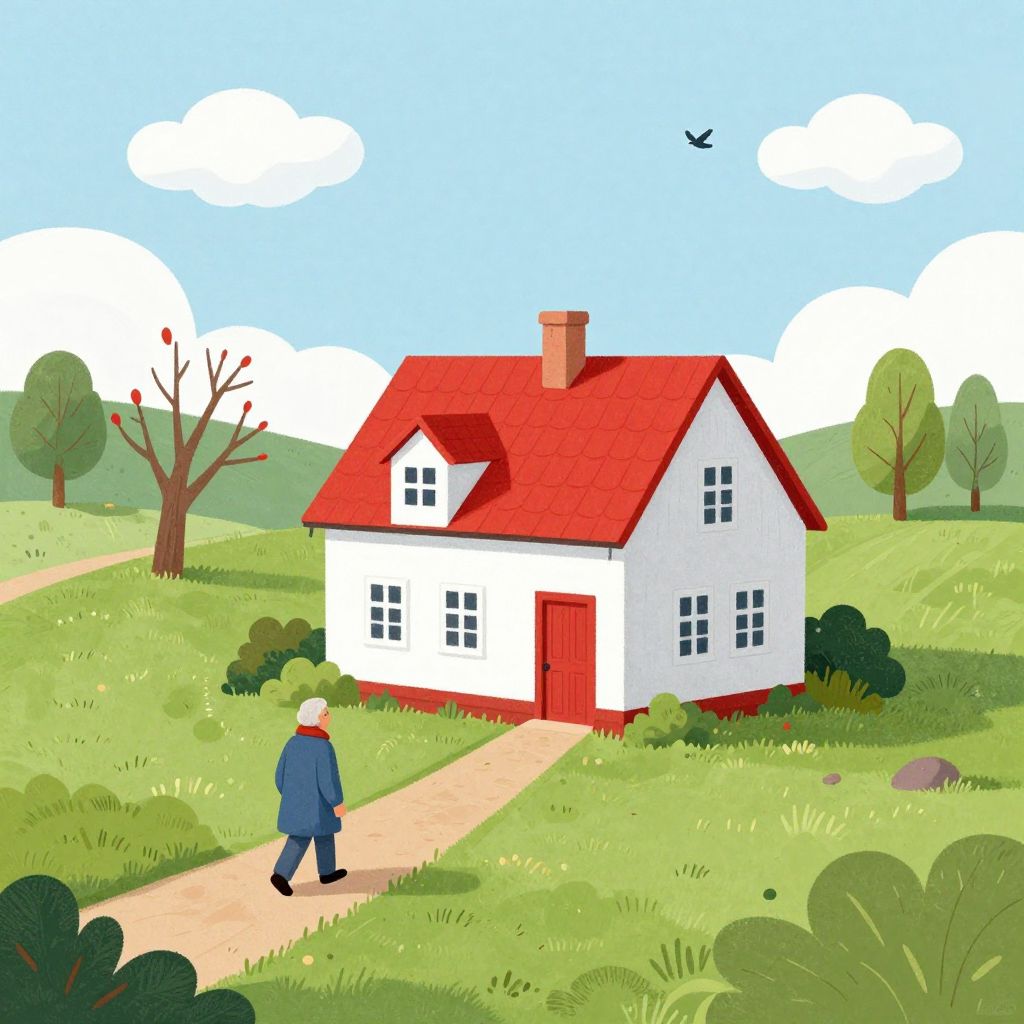 In this charming illustration, a quaint, two-story house with a vibrant red roof and white walls stands proudly in the center of the scene. The house features two chimneys and a small, inviting porch with a red door. To the left of the house, a fifty-year-old man, dressed in a blue coat and a red scarf, walks along a winding path that leads up to the house. The man's posture suggests a sense of calm and contemplation. Surrounding the house are lush, green fields with scattered bushes and trees, one of which has a unique, bare trunk and red leaves. The sky above is a soft, pastel blue with a few fluffy clouds, and a lone bird can be seen flying in the distance. The overall composition is balanced, with the house and the man as the focal points, creating a serene and nostalgic atmosphere.