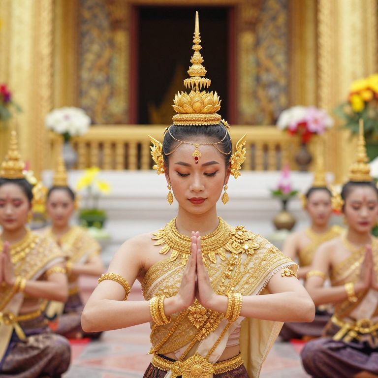Photograph of an Asian woman in traditional golden Thai dance attire, performing a prayer pose in front of a temple, surrounded by similarly dressed dancers.
