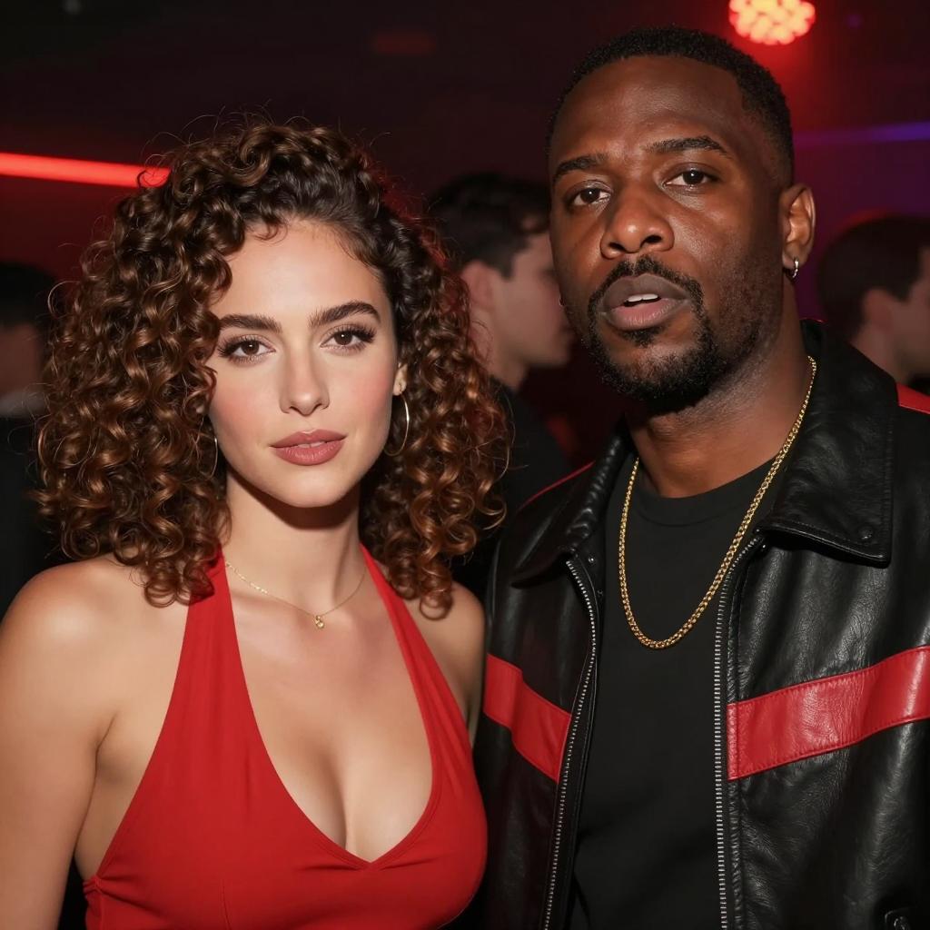A black couple in a dimly lit bar. Man wears beige suit, white shirt, red tie, and brown fedora. Woman wears white sleeveless top, has curly hair. Both seated at a wicker table with drinks and snacks. Man's left arm rests on table, woman's right arm rests on man's shoulder. Background includes blurred patrons and bartender.