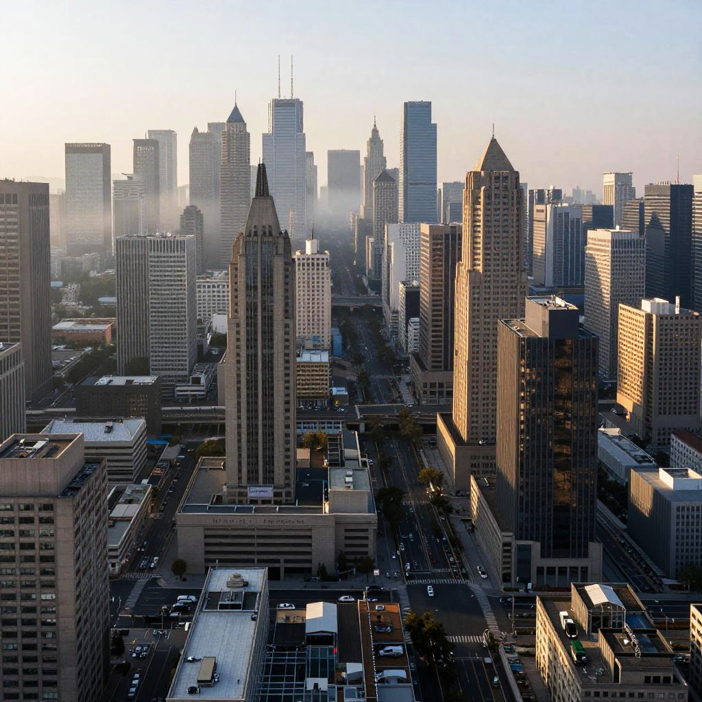 Vast city at dawn, endless rows of skyscrapers stretching to the horizon, mist hovering over highways and bridges, warm soft light casting long shadows, intricate network of streets and rooftops, combining modern and brutalist styles in a breathtaking metropolis