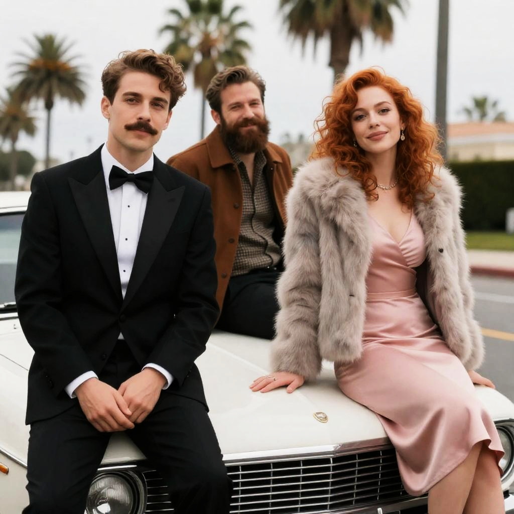 Photograph of three people sitting on the hood of a white vintage car. The man on the left wears a black tuxedo and black bow tie, with a mustache. The middle man has a beard, brown jacket, and checks, leaning with a relaxed smile. The woman on the right has curly red hair, wears a pink satin dress and a grey fur coat, with crossed legs and a smile. Background features palm trees.