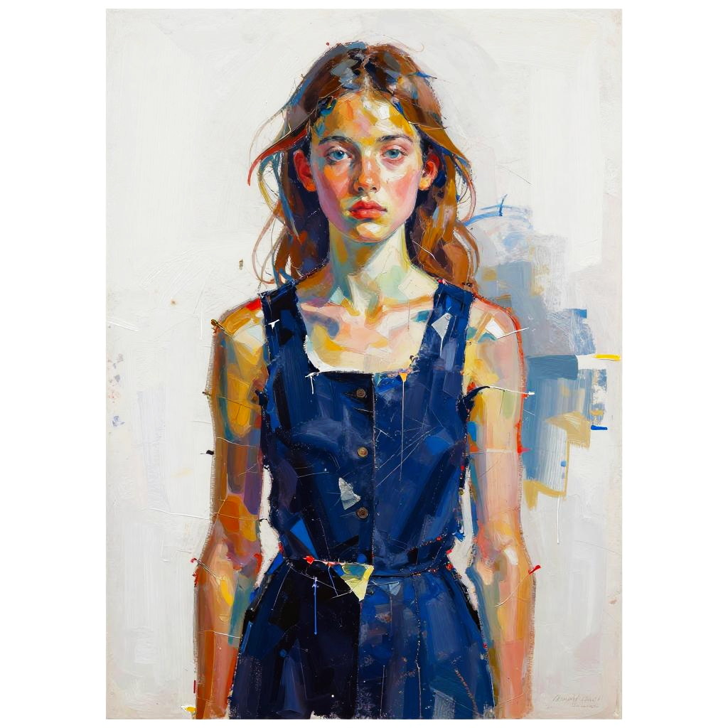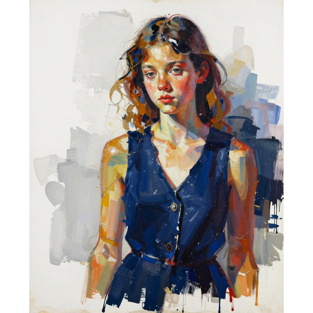 Expressionist semi-abstract portrait of nested teenage girl donned in deep navy vest with fragmented amber limbs, rendered in modernist acrylic wash layered with torn paper accents and drips, high-contrast bold colors, loose gestural strokes and textured paint ridges, minimal white negative space with asymmetrical crop, cobalt-shadow accents and suggestive contours, emotive restless energy balanced by reflective tenderness, contemporary art poster vibe, painterly chaos with subtle drips, unresolved edges, luminous highlights.