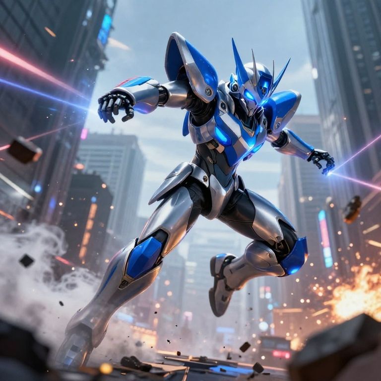 CGI image of a dynamic, blue and silver robotic warrior, standing in a futuristic cityscape. The robot has a sleek, armor-plated body with glowing blue accents, sharp angular features, and a helmet with spiked protrusions. It is mid-stride, with one arm extended forward and the other back, emitting blue laser beams. The background shows tall, illuminated skyscrapers, and the ground is scattered with debris and smoke, with bright, neon lights and fiery explosions adding a sense of action and chaos. The image has a high-energy, sci-fi aesthetic with vivid colors and sharp contrasts.