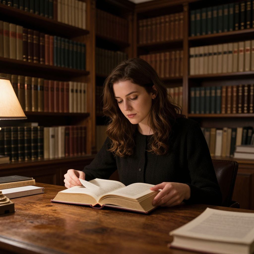 Photograph of a young woman with long brown hair, wearing a black blouse, reading an open book under a warm lamp, surrounded by bookshelves