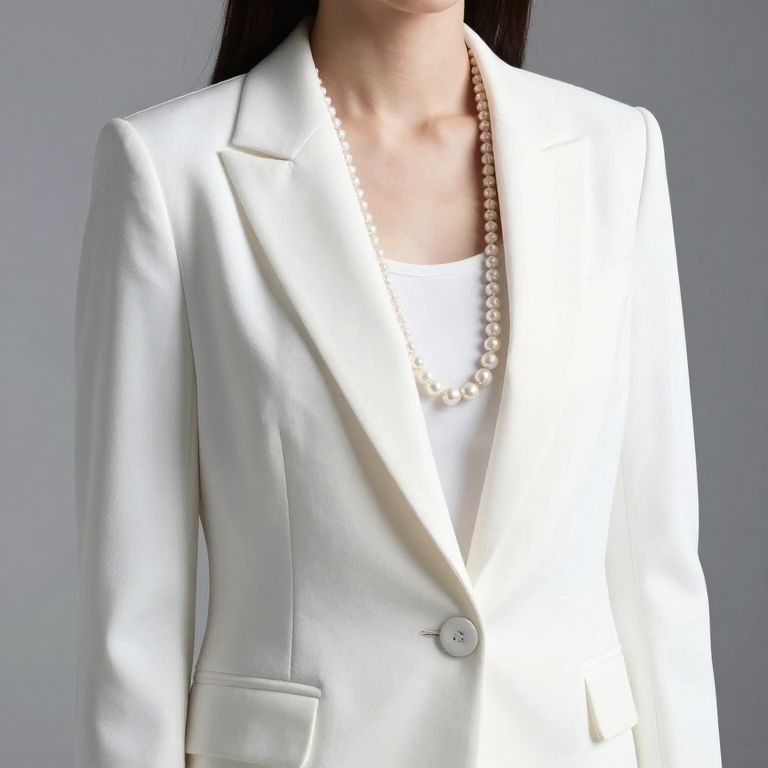 Photograph of a woman's upper torso, focusing on a white, tailored blazer with a single button, over a white top. She wears a long, pearl necklace that rests on her chest. Her long, dark hair is partially visible. The background is a plain, light gray. The blazer's fabric appears smooth and slightly reflective, with a classic, structured design. The overall style is formal and elegant. The lighting is soft, highlighting the white clothing and pearls.