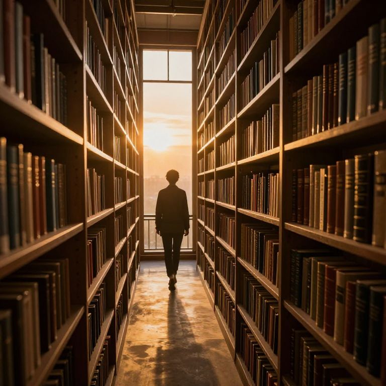 In the hushed embrace of an endless library, a solitary figure walks toward the horizon where the sun hangs low, casting a golden glow over rows of ancient tomes—each a silent witness to untold worlds, their spines whispering secrets of forgotten narratives as the air hums with the promise of infinite stories yet to be discovered.