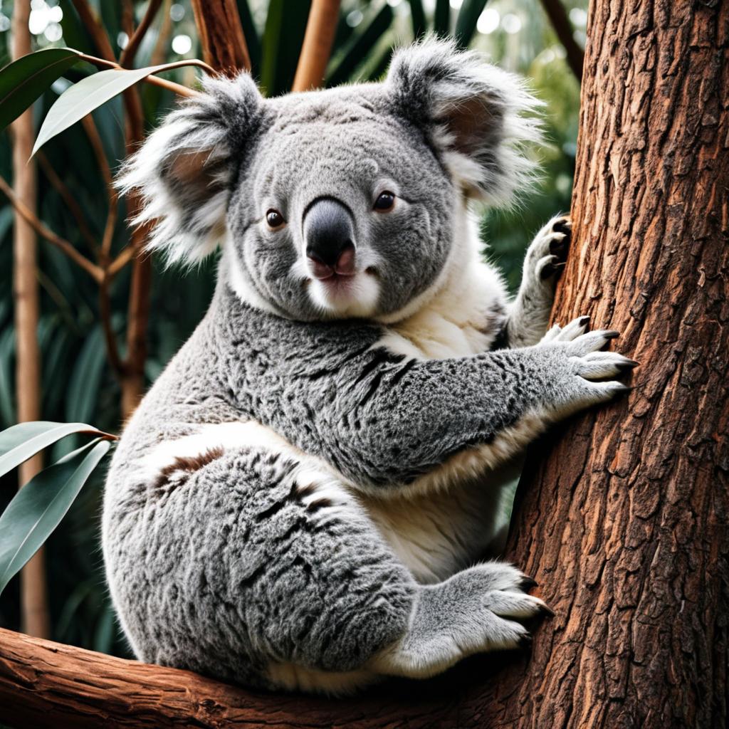 A super fat koala with a round, oversized body, full of personality and charm. The hugging a tree emphasizes its plumpness, with soft, fluffy fur and a relaxed expression. Rendered in a realistic, the scene captures the cozy and lovable appeal of a very large, contented cat, adding a playful and lighthearted vibe to the artwork.