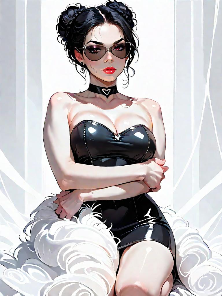 Digital artwork of a woman with a realistic face and full body shot, wearing a modern edgy strapless black vinyl mini dress with a sweetheart neckline and body-hugging silhouette. She is accessorized with narrow rectangular sunglasses, a heart-shaped choker, and has her dark hair styled in two high buns. The background is a clean white studio setting.
