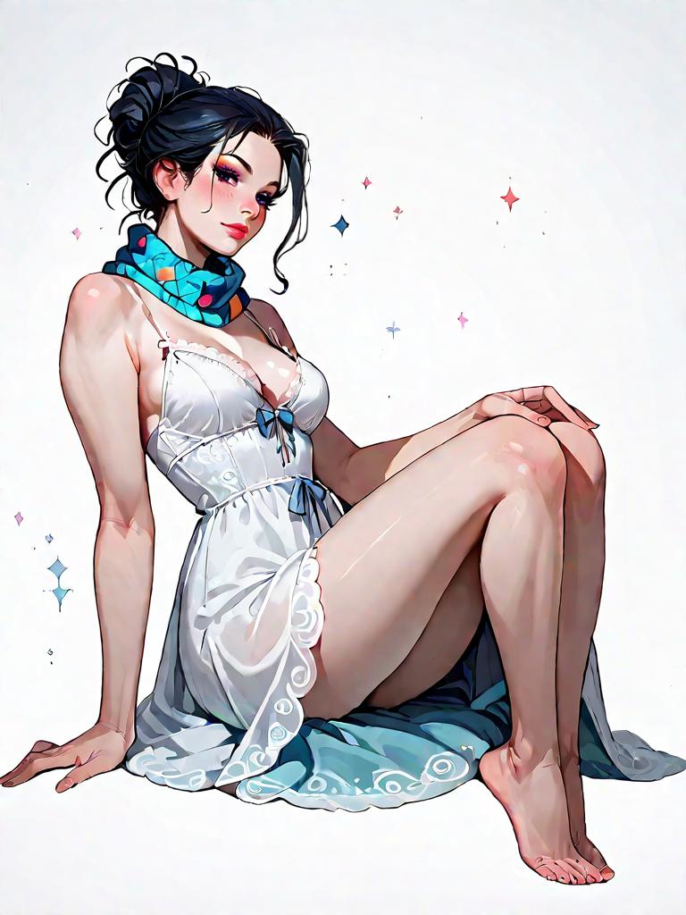 1girl, source_comics, realistic face, full body shot, Woman, modern edgy, strapless vinyl mini dress in glossy black, sweetheart neckline, body-hugging silhouette, thigh-length, accessorized with narrow rectangular sunglasses, hair styled in a top bun, white studio background.