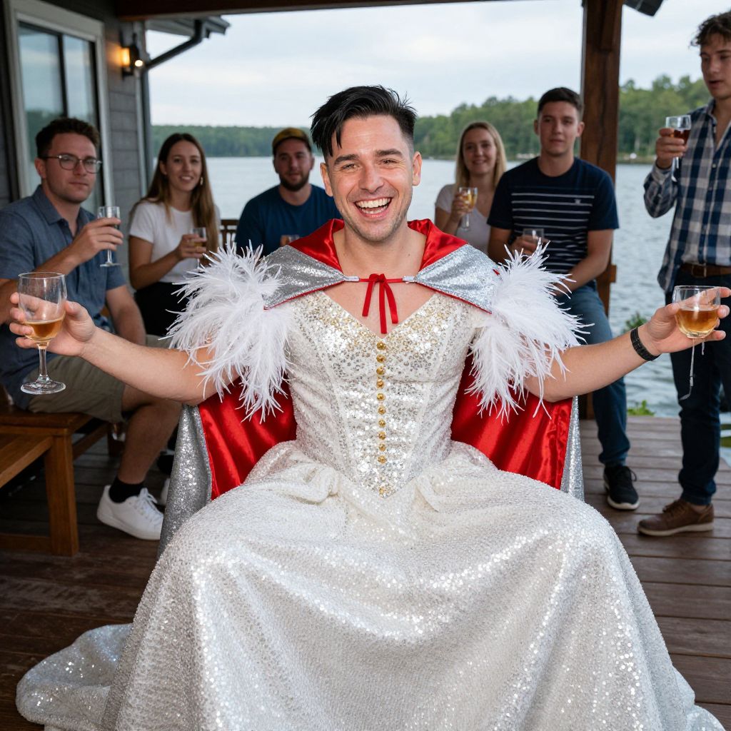 A joyful, well-lit photo of a man in a hilarious bachelor party dress costume — a customized, sequined version of a bridal gown with a full skirt, feathered sleeves, and a red and silver cape — sitting on a wooden deck at a lakeside cabin, with a group of friends in casual attire around him, holding drink glasses, capturing his broad smile, friendly facial features, and relaxed facial tone, fair complexion, short black hair with a side part, hazel eyes.