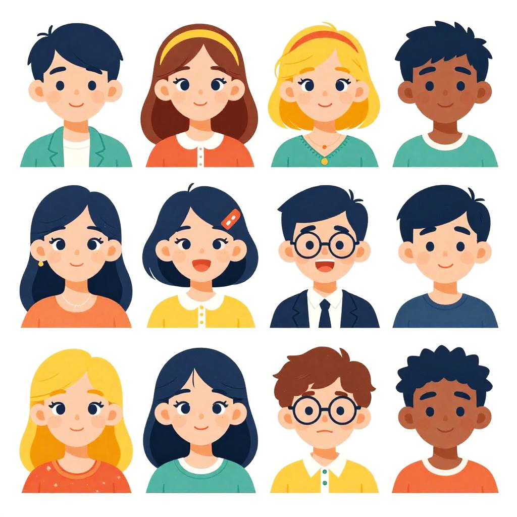 Personality cartoon characters featuring diverse emotions and styles, whimsical backgrounds, bold outlines, playful accessories, bright palettes, in a fun and engaging comic book style