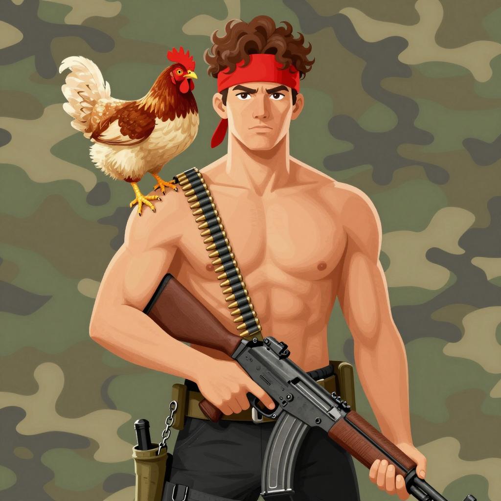 Muscular man with curly brown hair, red headband, and camo-pattern background. Shirtless, wearing black pants, holding a rifle with bullet belt across chest. Chicken with red comb and wattle perched on his left shoulder. He has a determined expression. Digital illustration. Green and yellow camouflage pattern.