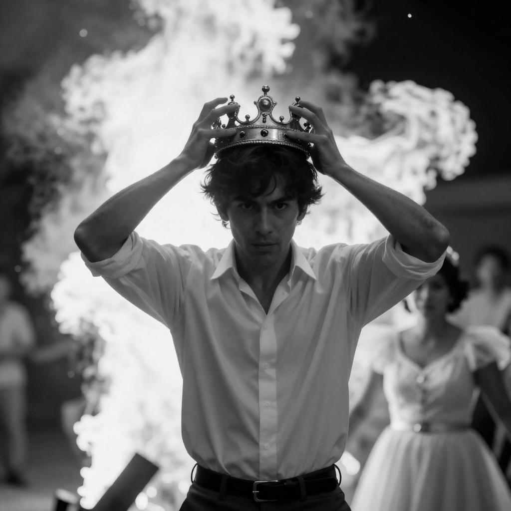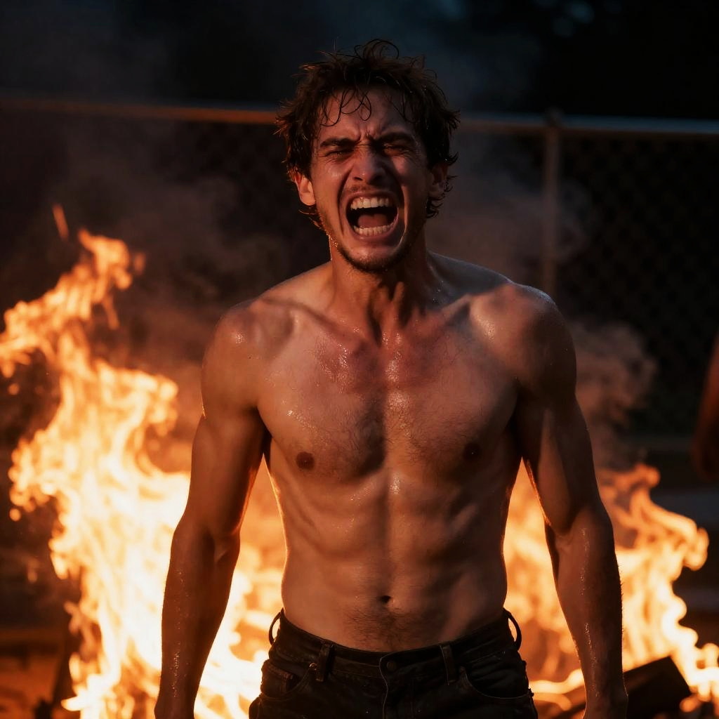 Man with short brown hair, shirtless with wet, torn clothing, screaming in pain. Standing amidst bright flames in front. Dark, chain-link fence background. Flames on left and right. Intense facial expression. Nighttime setting.
