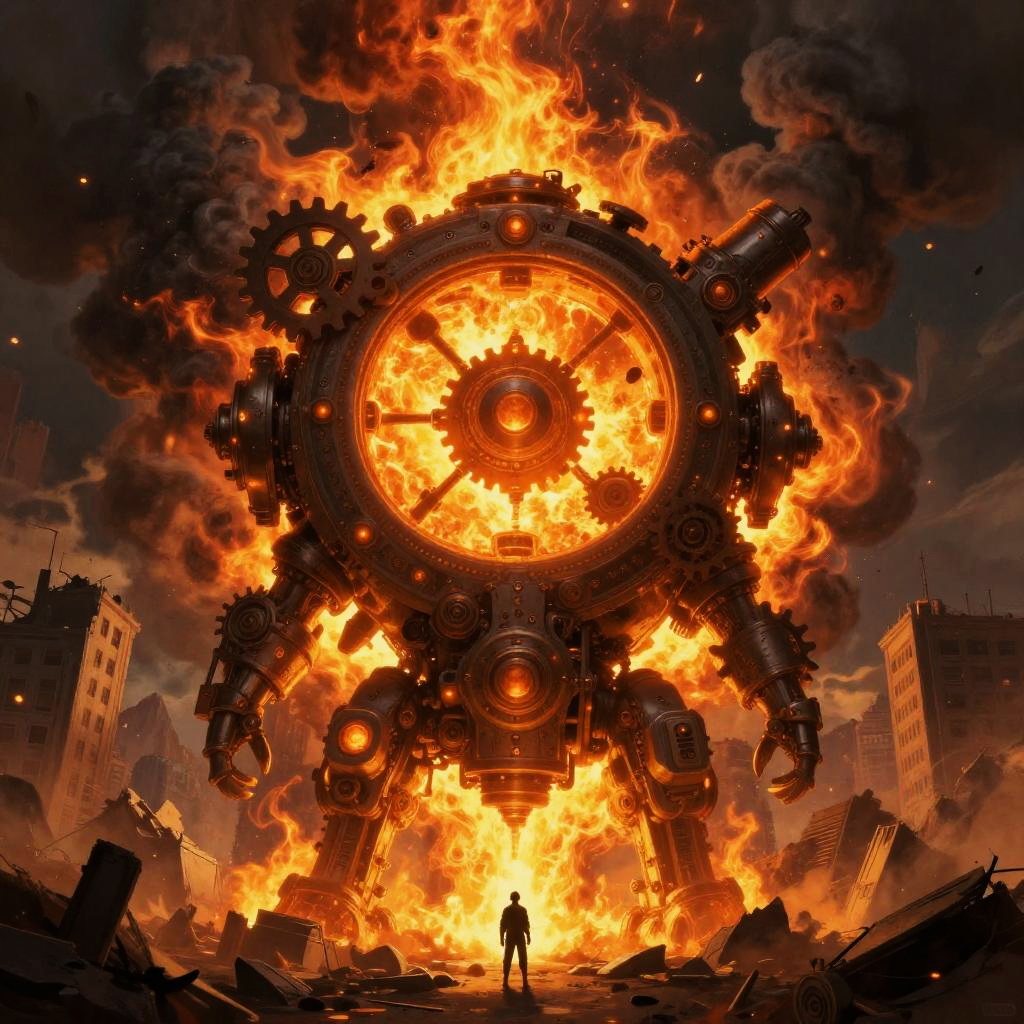 A dramatic digital artwork of a massive, circular, steampunk-style structure engulfed in intense flames and thick black smoke. The structure has intricate, metallic gears and glowing orange eyes. A small figure stands at the base, surrounded by ruins and debris. The sky is partly cloudy, adding contrast to the fiery scene. The image has a dark, apocalyptic vibe.