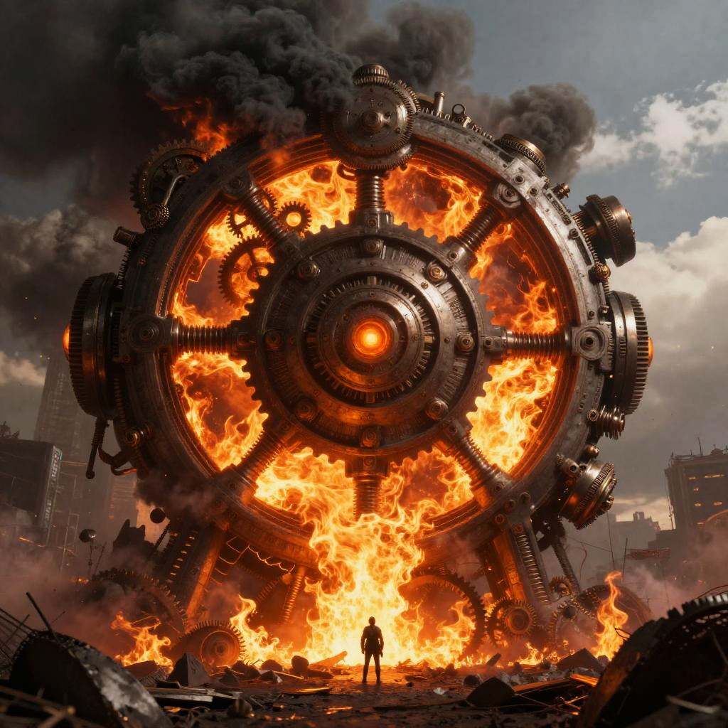 Digital artwork depicting a massive, circular, industrial machine engulfed in bright, fierce flames. The machine has intricate gears and metallic components, with smoke billowing from its top. A small, silhouetted figure stands at the bottom center, gazing up at the blazing structure. The background shows a cloudy sky and the ruins of a cityscape with tall buildings in the distance. The colors are vivid, with bright oranges and yellows from the flames contrasting with the dark grays and blacks of the machine and smoke. The overall style is hyper-realistic with dramatic lighting and intense, chaotic energy.