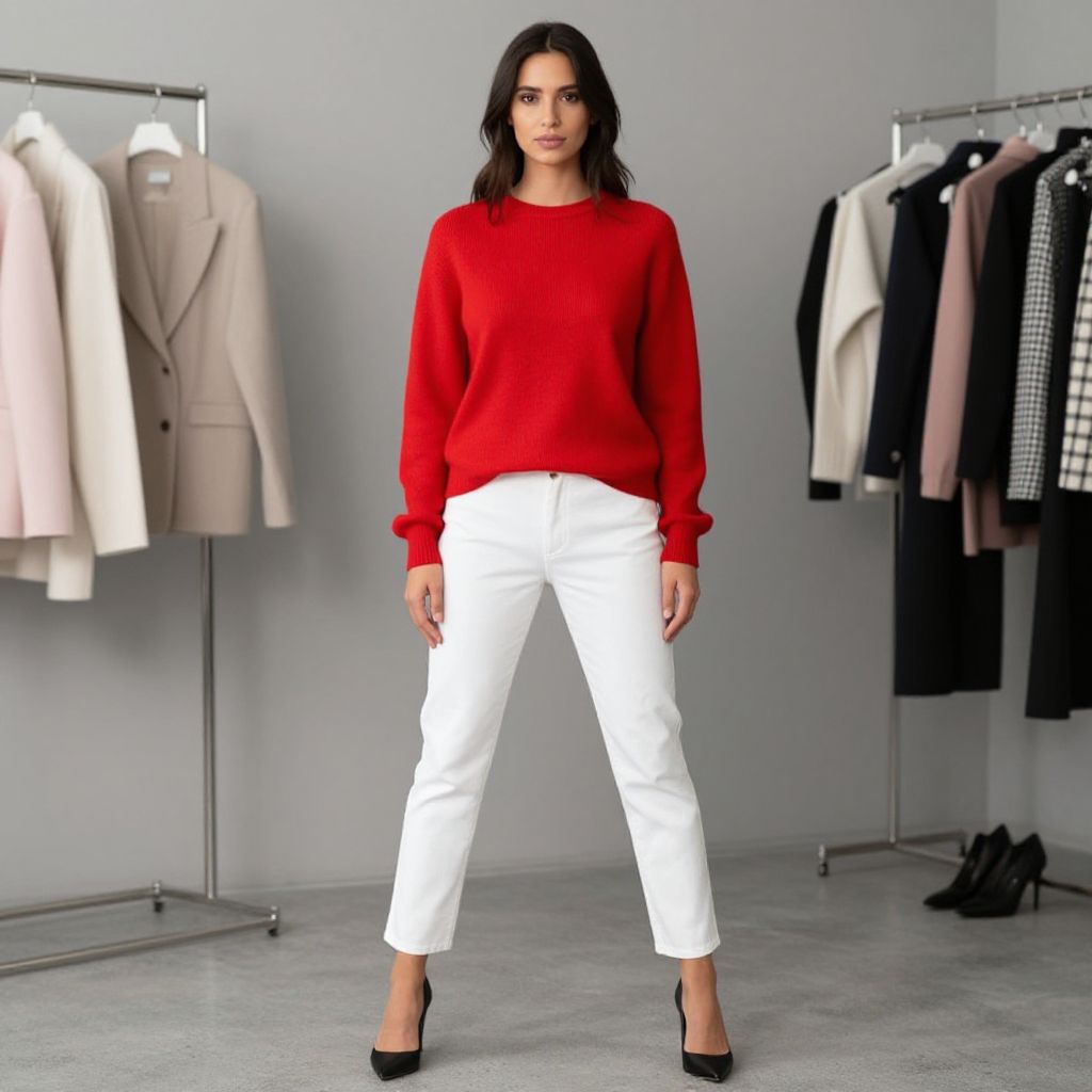 "Woman Designer Sweaters, a woman in a red sweater and white pants posing for a picture"