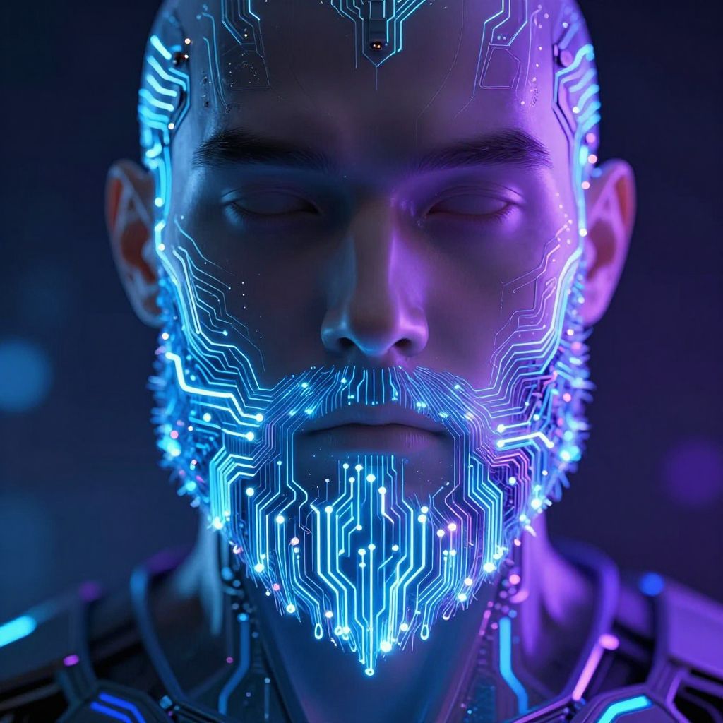 Beard AI concept art, futuristic humanoid robot with an intricately designed digital beard glowing with neon circuits, cyberpunk city background, high-tech and sleek design, vivid blue and purple lighting, ultra-detailed, science fiction theme