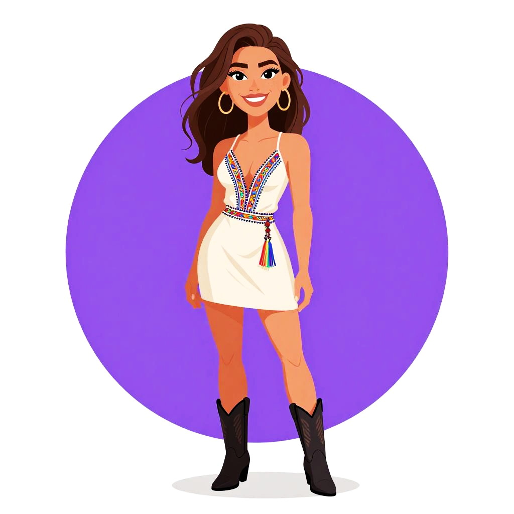 Woman with pretty face and pretty hair. Woman, boho chic, sleeveless mini dress with floral print in purple, black, and green, white lace panels on the bodice, ruffled hem, brown leather ankle boots with a slight heel, plain white background. --sref 1467