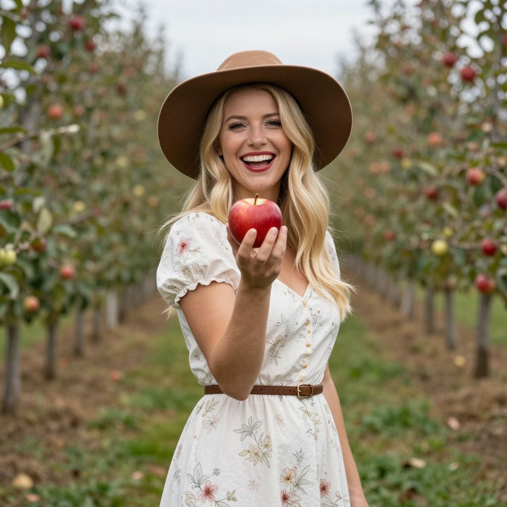 Blonde woman wearing a wide-brimmed brown hat and a white floral dress stands amidst rows of apple trees in Vermont, holding a vibrant red apple while smiling joyfully.