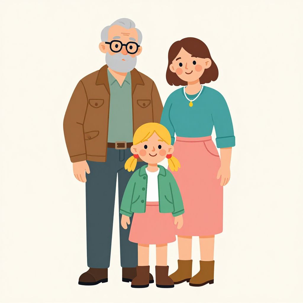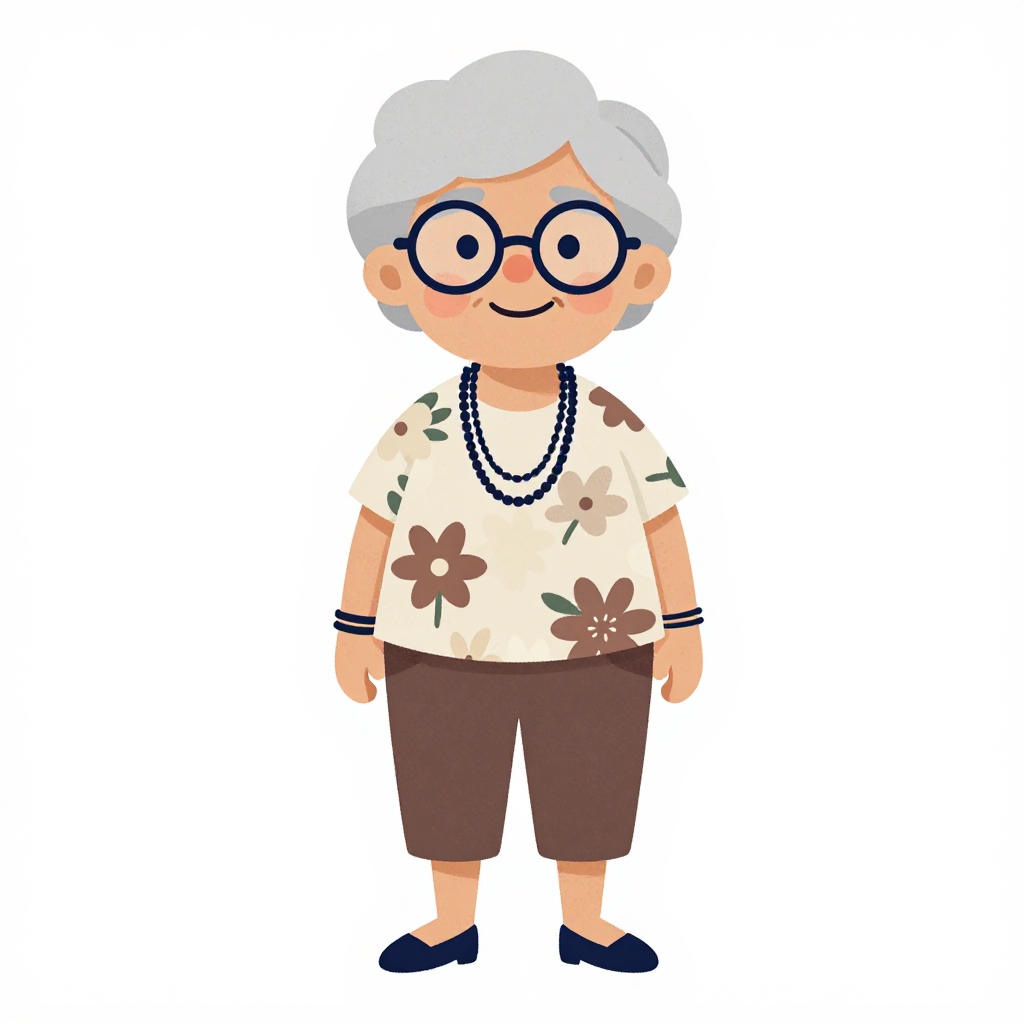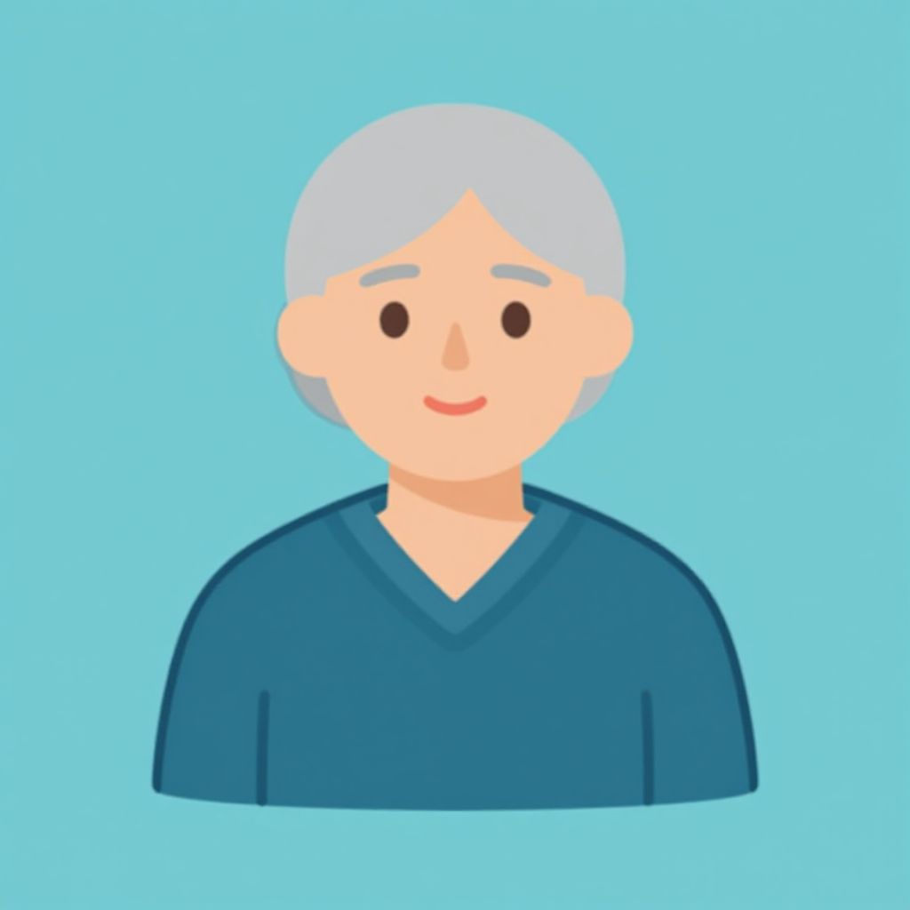 Digital cartoon of elderly person with light blue hair, fair skin, simple smile, wearing dark blue V-neck shirt, against light blue background.