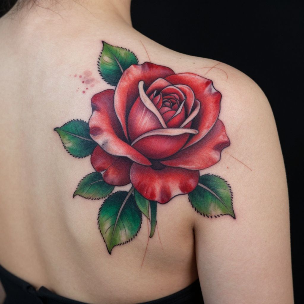 Elegant red and green rose tattoo on back shoulder, lush petals with gradient transitions from deep red to bright green leaves, accompanied by subtle watercolor splashes and fine line accents, a harmonious combination of realism and artistic flair.