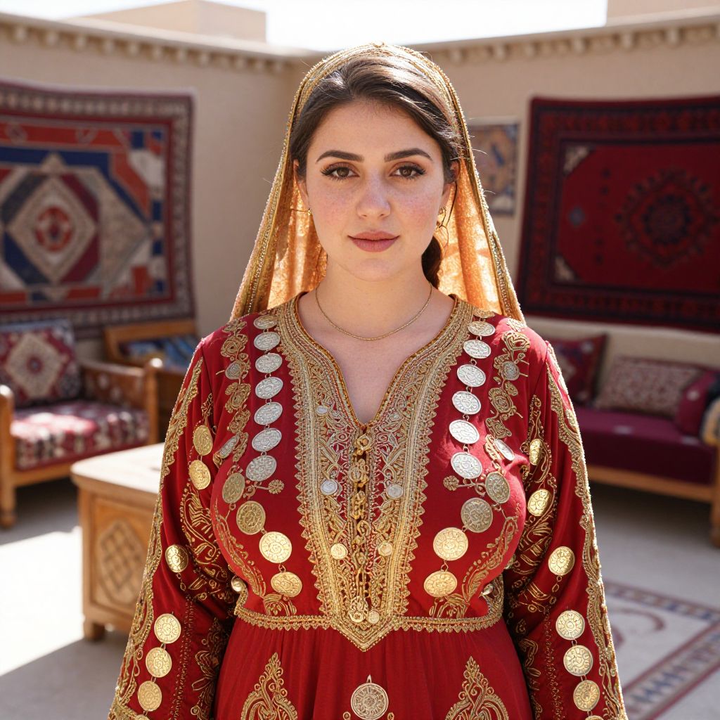 Photograph of a fair-skinned woman with dark hair, wearing a red traditional embroidered dress and gold jewelry, in a sunlit room with patterned