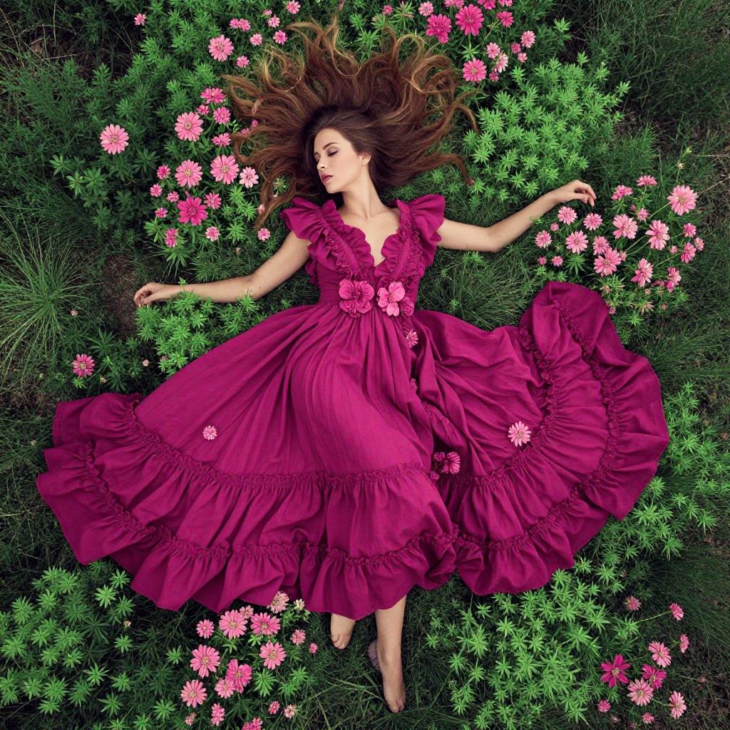 Photograph of a fair-skinned woman with long, flowing brown hair lying on her back in a grassy field adorned with pink flowers. She wears a deep magenta, ruffled, Victorian-style dress with a plunging neckline and flower embellishments on the bodice. Her arms are gracefully extended to the sides, and her dress fans out around her, blending with the greenery and pink flowers. The vivid colors and soft textures create a whimsical, dreamlike atmosphere. Her serene expression adds a sense of tranquility to the image.