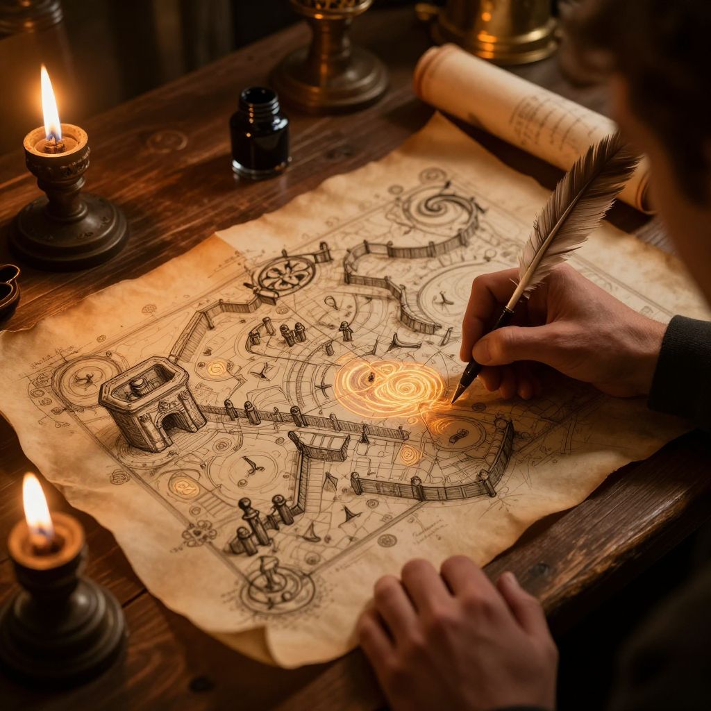 Map maker DnD artist working at wooden desk, sketching a sprawling dungeon layout, fantasy RPG style, torches flickering, rolls of parchment, quill and ink, medieval fantasy atmosphere, rich textures, glowing magical runes on the map