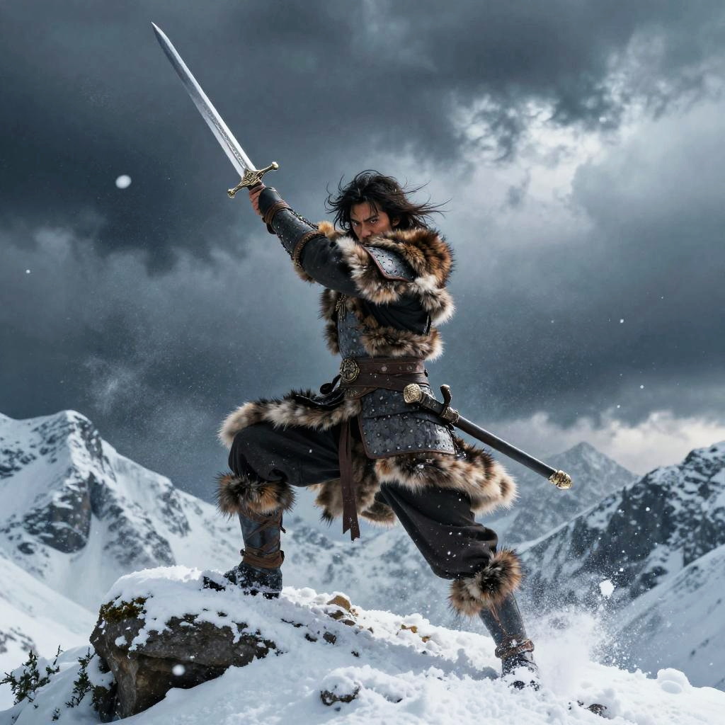 Silhouetted warrior with sword on rocky peak at sunrise, wind blowing through cape, mist below, mountains in background, dramatic sunset light.