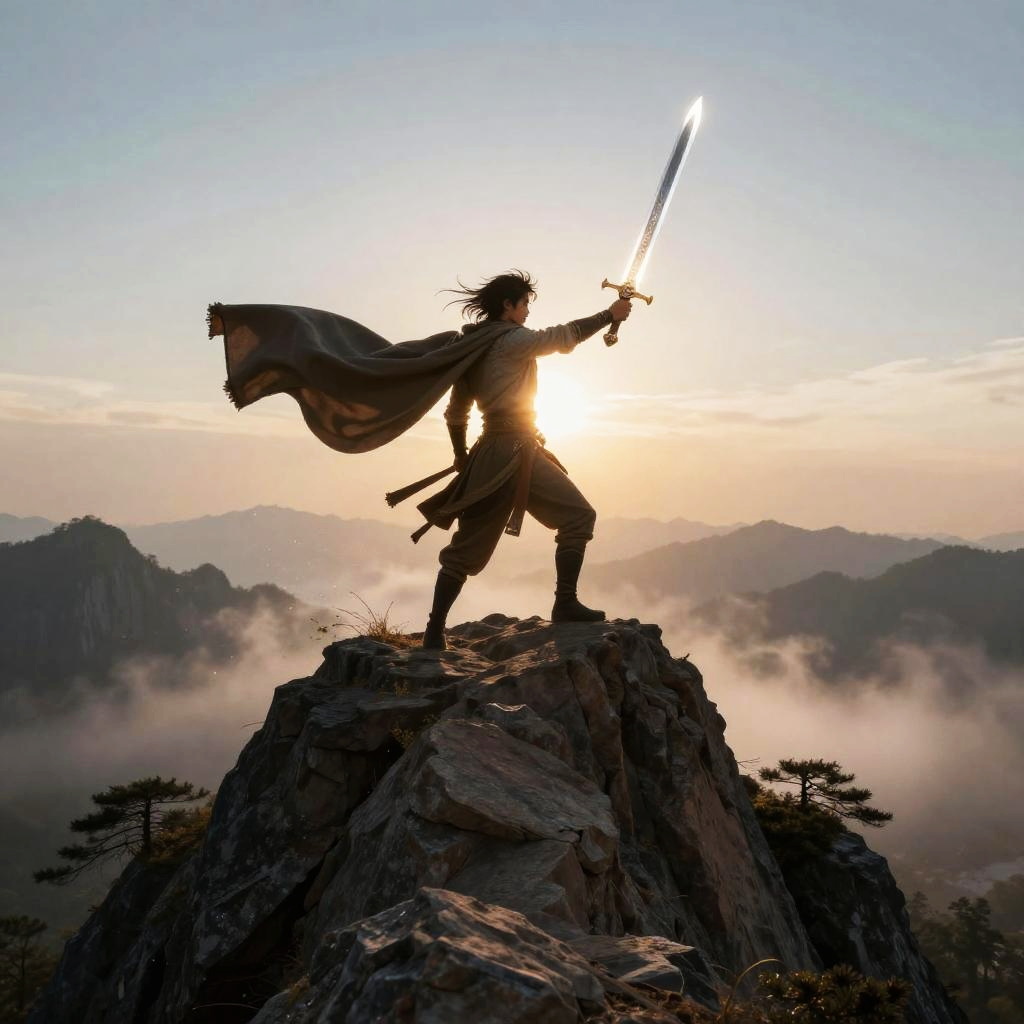 A dramatic scene of Eniu, a warrior of light, standing atop a rugged mountain peak at dawn, wielding a radiant sword, cape flowing in the wind, surrounded by swirling mist and glowing particles, symbolizing strength and hope.