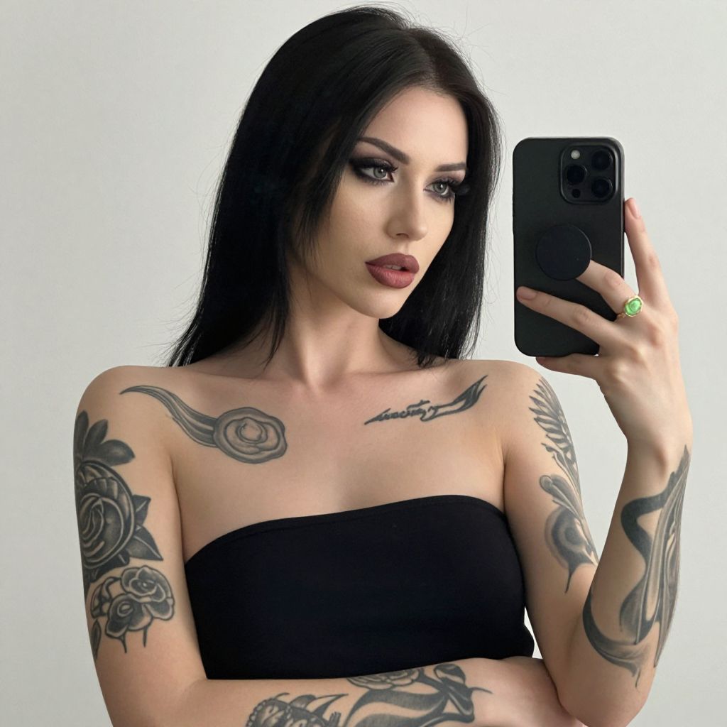 Photograph of a pale-skinned woman with black hair in a straight ponytail, taking a mirror selfie. She's heavily tattooed with intricate black and grey designs on her arms and chest, wearing a black strapless top. She has dark eyeliner and is holding a black phone with a green pop socket. The background is a plain white wall.