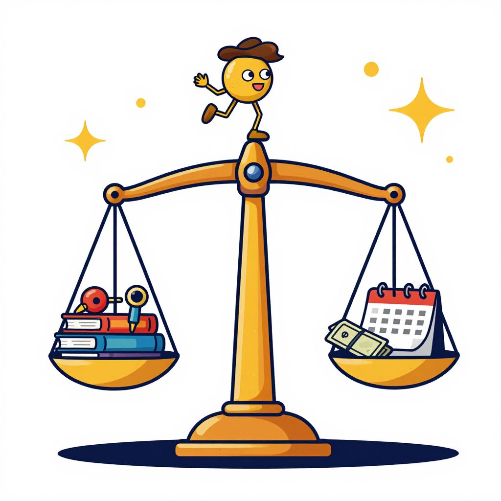 Adulting illustration, a whimsical depiction of balancing fun and responsibilities with a scale, one side toys and books, other side bills and calendar, bright bold colors, cartoonish yet sophisticated style