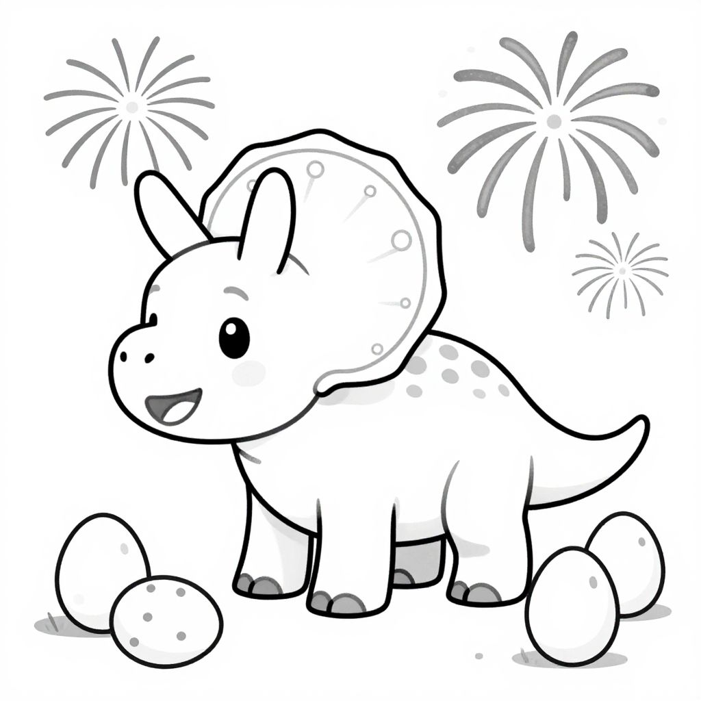 Fireworks Coloring pages for children, cartoon style, a happy baby Triceratops, dinosaur eggs around it, anatomically well drawn arms and legs of the dinosaur,