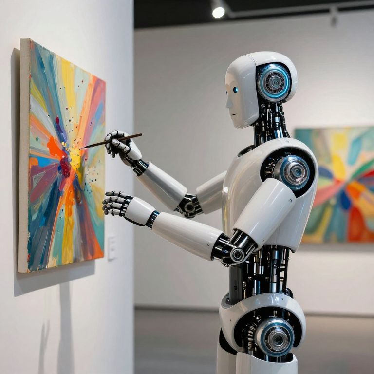 Photograph of a sleek, white humanoid robot with black joints and blue circular sensors, standing in an art gallery. The robot, with a smooth, glossy texture, is holding a paintbrush and delicately touching it to a vibrant, abstract painting on the white wall in front. The painting features colorful, radial splashes of orange, blue, yellow, and green. Another blurred abstract painting is visible in the background. The gallery has a modern, minimalistic design with soft, diffuse lighting. The robot's expressionless face and precise movements contrast with the dynamic, expressive artwork.