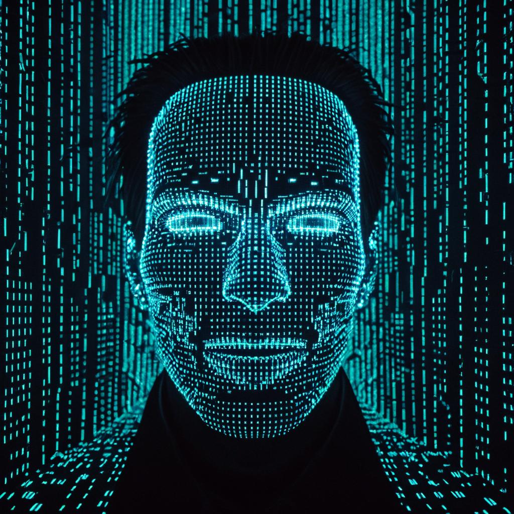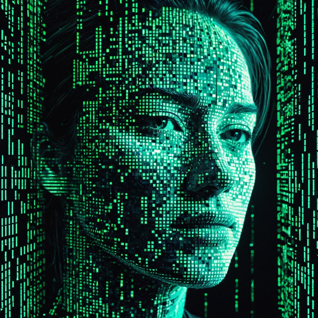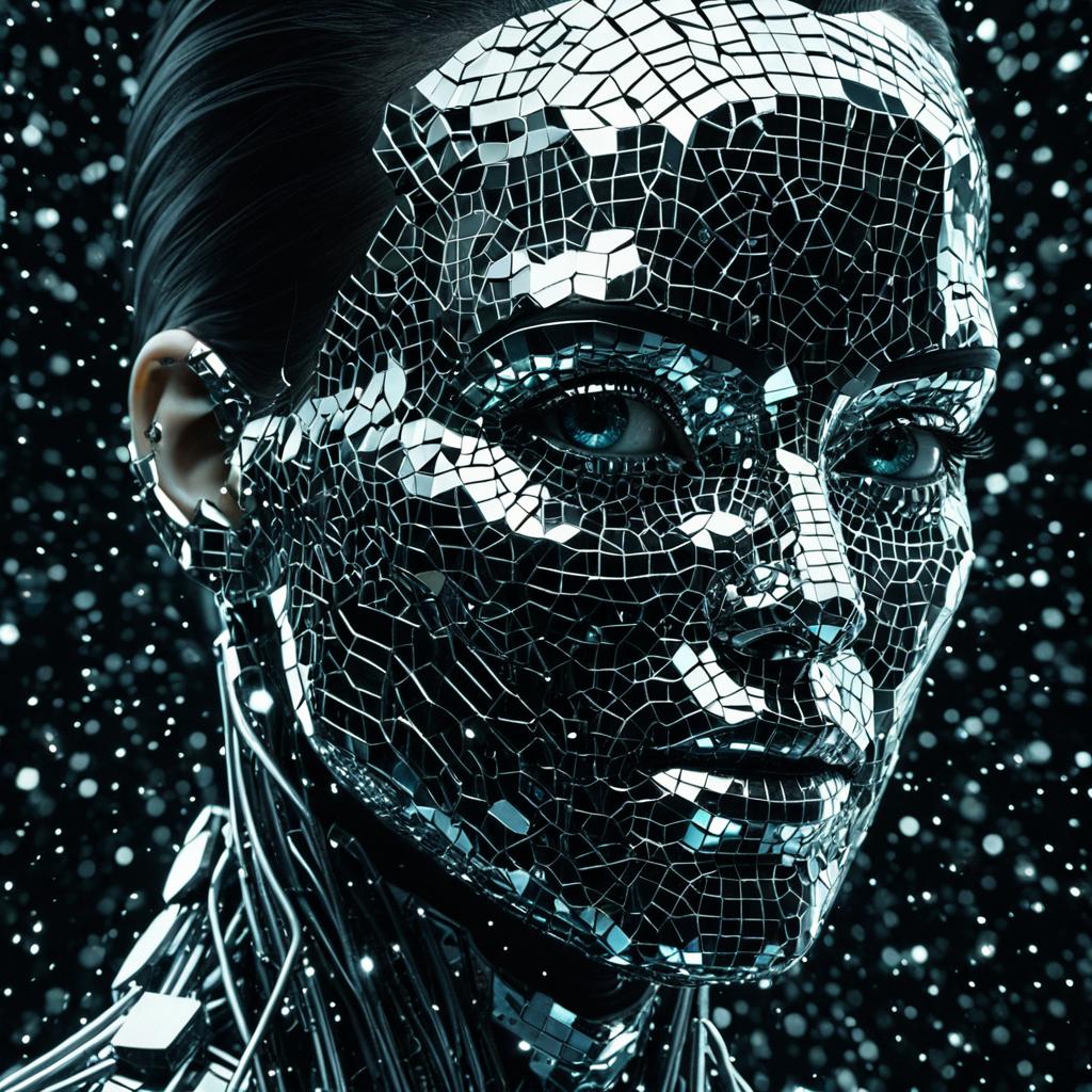 3D glass rendering of an android child emerging from a pixelated cascade. The design includes iridescent shades, with surreal lighting and abstract 3D elements creating a high-energy, dynamic composition.