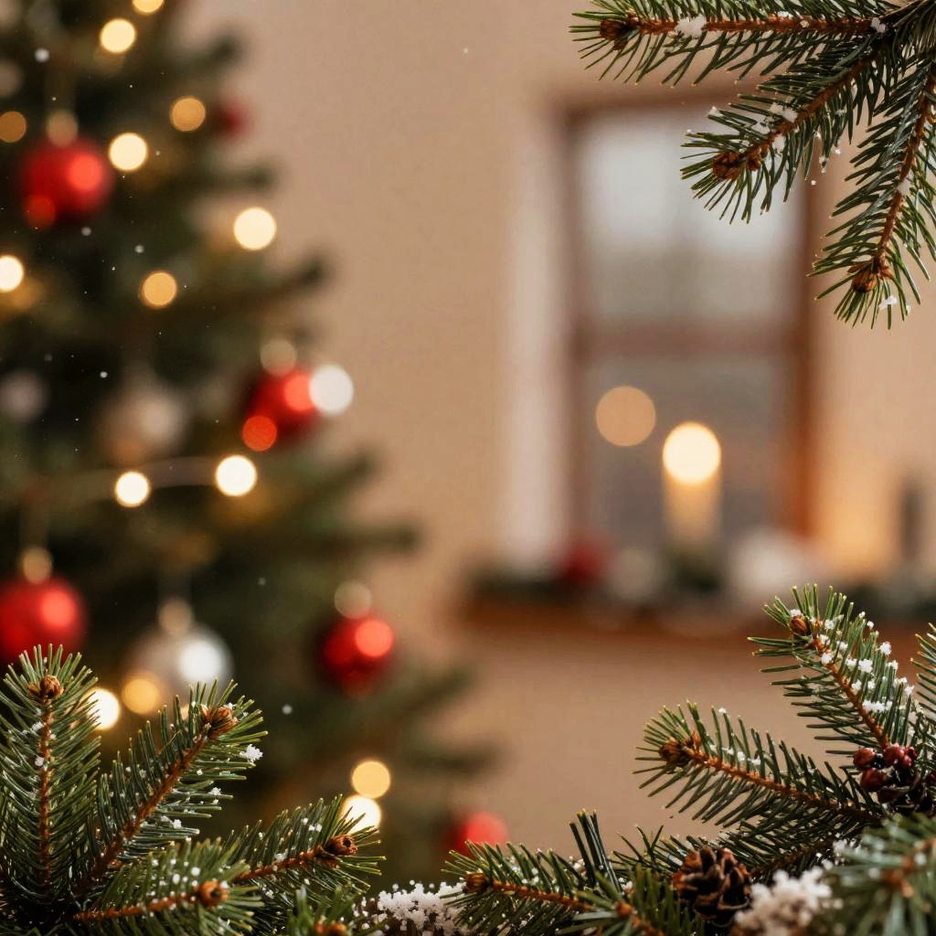 Add a Santa hat to a photo of a bustling holiday market at night, with people wearing scarves and coats, wooden stalls selling ornaments and treats, glowing lanterns, and a large decorated Christmas tree shining in the center square.