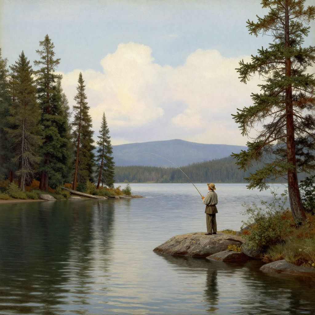 In this watercolor painting by John Singer Sargent, a man stands in a serene Montana stream, his face illuminated by cinematic light against a white background. He wears a wide-brimmed hat and a rugged, tan outfit, with a blue scarf around his neck and a backpack slung over his shoulder. His hands grip a fishing rod, poised for action. The stream flows gently around him, reflecting his image and the surrounding rocks and trees. The painting captures the tranquil beauty of the natural landscape, with soft, blended colors and a sense of depth created by the interplay of light and shadow. The man's contemplative expression and the peaceful setting evoke a sense of solitude and connection with nature.