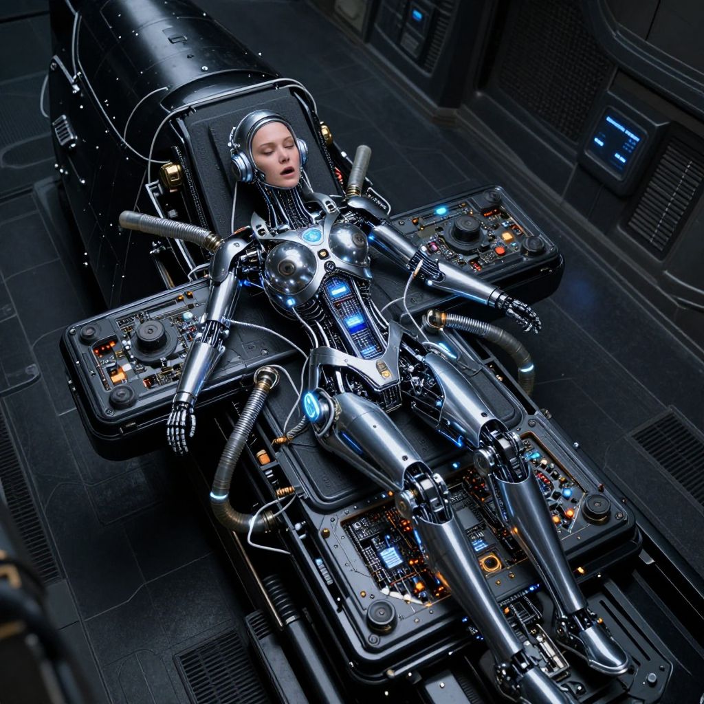Scene in dark art deco black jet cockpit featuring full body of beautiful electromechanical robot fragile cyborg pilot woman made of elegant electronics with complex shiny parts, bound to piloting seat cruciform mated to glowing electronic mainframe jet cockpit with luminous bondage cables many pneumatic hoses. face agog. biomechanical depth of field octane unreal escher geiger