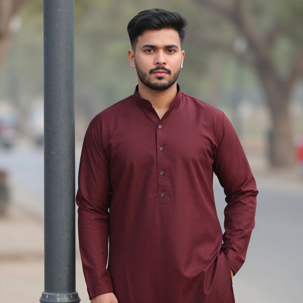 Photograph of a young South Asian man with a medium build, dark hair, and trimmed beard, standing outdoors. He wears a long-sleeved, buttoned-up maroon kurta with his hands in his pockets. His expression is neutral. The background is blurred, featuring a street with a black pole on the left and indistinct trees and buildings. The lighting is natural, suggesting daytime. The man's skin tone is medium, and the overall atmosphere is calm and urban.