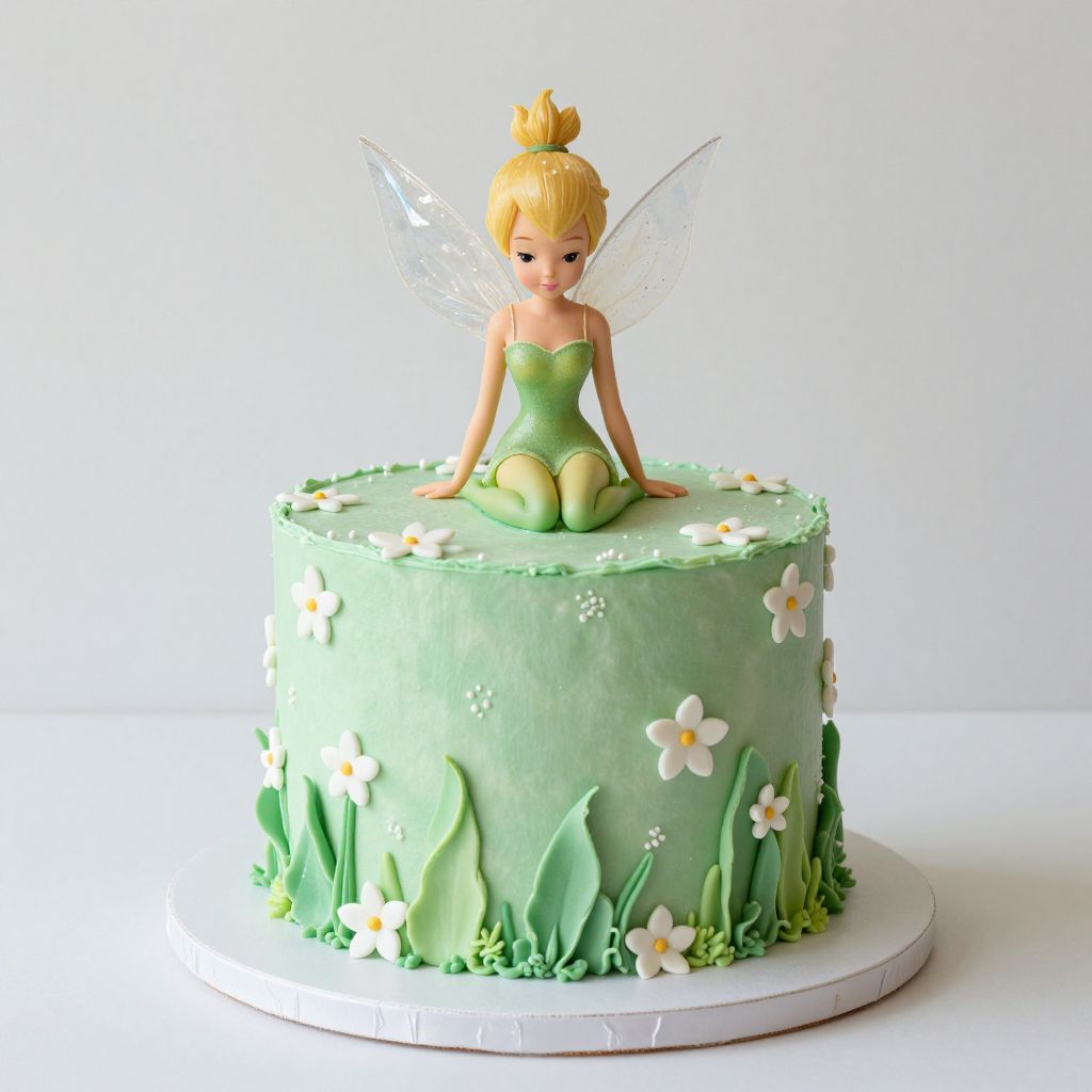 Photograph of a princess-themed cake with a blonde doll in a blue dress, white gloves, and pink square base with "5" and swir