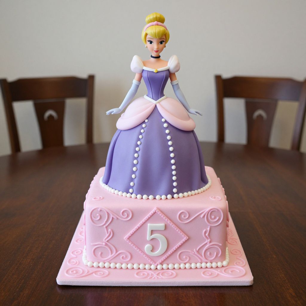 Elegant Disney Princess-themed birthday cake featuring a tiered design with a purple and pink gown adorned with white pearl accents, topped by a figurine of Cinderella, set on a square pink base decorated with swirl patterns and the number \"5\" in a diamond frame, placed on a dark wooden table with two chairs in the background.