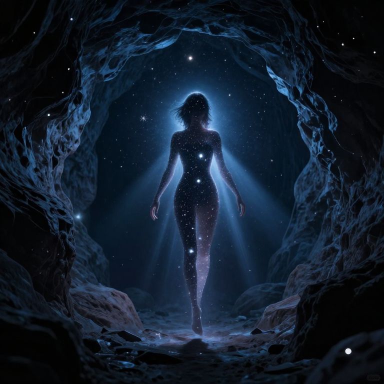 A digital artwork depicts a glowing, illuminated archway at the top of a spiraling, stone staircase against a twilight sky. The arch emits a bright, white light, revealing a silhouette of a standing figure inside. The staircase, textured with rough, weathered stone, twists upwards to the arch, which is centered in the image. The sky features soft, warm hues of orange, pink, and purple, with scattered clouds. The overall style blends realism with a surreal, otherworldly atmosphere. The figure's gender and specific details are indistinguishable due to the backlighting.