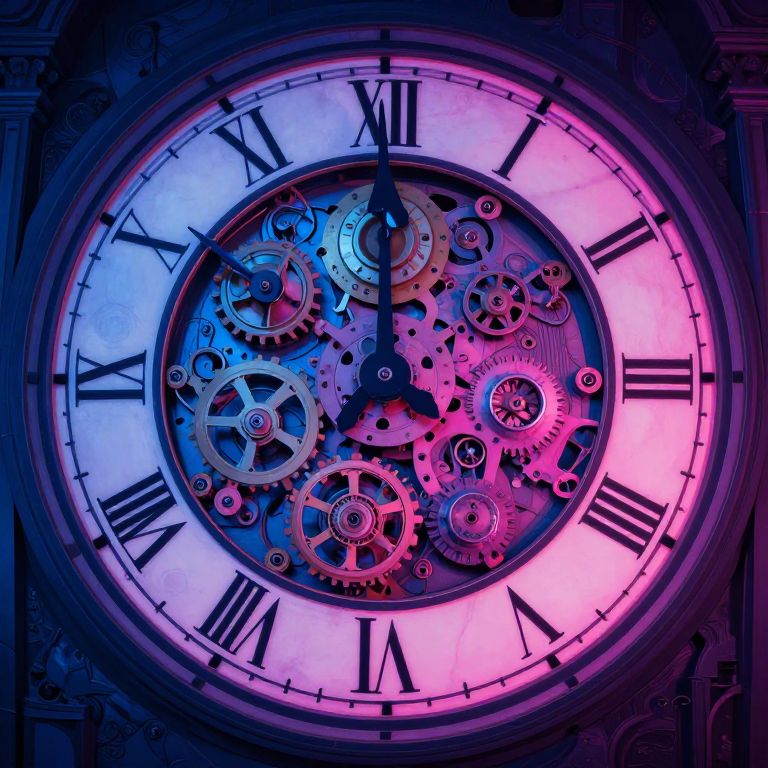 Imagine a whimsical scene within an enormous clock face where time distorts and meanders. From a first-person viewpoint, stroll along the clock's hour indicators on your hands as you navigate through its intricate machinery, creating a fantastical mechanical world. The hues transition from rich blues to vivid pinks in a mood-evoking gradient that encapsulates both the awe-inspiring grandeur and slightly unsettling aura of this enigmatic realm.